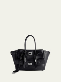 Balenciaga "Bel Air" tote bag in smooth calfskin leather and fabric Rolled top handles with keyring tag Detachable, adjustable crossbody strap Can be worn as a top handle or crossbody bag Open top with center clasp straps; side snap closure Exterior, front flap with turn-lock closure Interior, one zip pocket Feet protect bottom of bag Approx. 6.7"H x 9.2"W x 3.1"D Cotton Made in Italy Online Inquiries: BGS21_V6H0B| Store Inquiries: #4991295