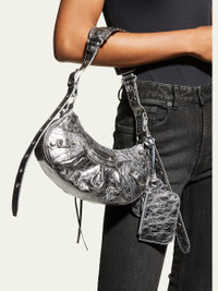 Balenciaga shoulder bag in crinkled metallic lambskin leather and fabric with studded trim Adjustable buckle shoulder strap, 18.1" drop Zip top closure with tassel pull Exterior, removable zip pouch and heart charms Fabric lining Approx. 6.3"H x 10.2"W x 2.7"D "Cagole" is made in Italy Online Inquiries: BGS21_V57Q8| Store Inquiries: #4159230