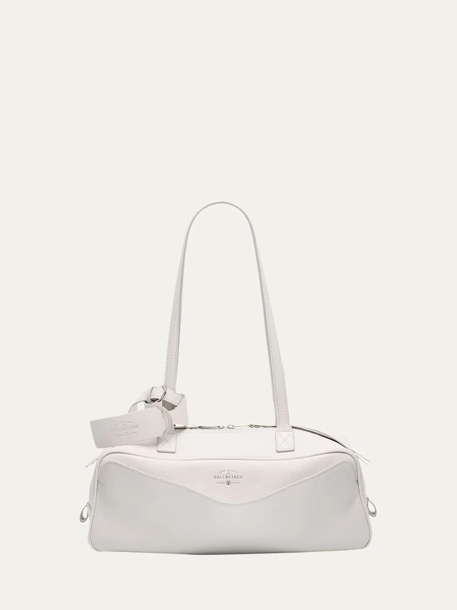 Balenciaga "Carrie" bowling shoulder bag in leather Shoulder straps with removable luggage logo tag Twoway zip top closures Exterior, one slip pocket, logo debossed with foil at front Interior, one zip pocket Approx. 12.2"H x 4.7"W x 4.7"D Made in Italy