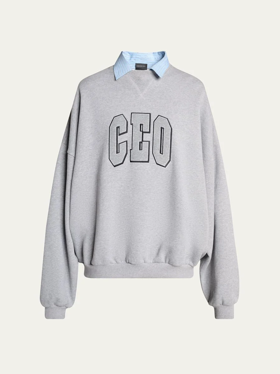 Balenciaga sweatshirt featuring CEO embroidered chest Crew neckline Long sleeves Drop shoulders Oversized fit Banded cuffs and hem Pullover style Cotton/viscose/nylon/polyamide Hand wash, machine wash line dry Made in Portugal Online Inquiries: BGS21_BA8C2| Store Inquiries: #5051766