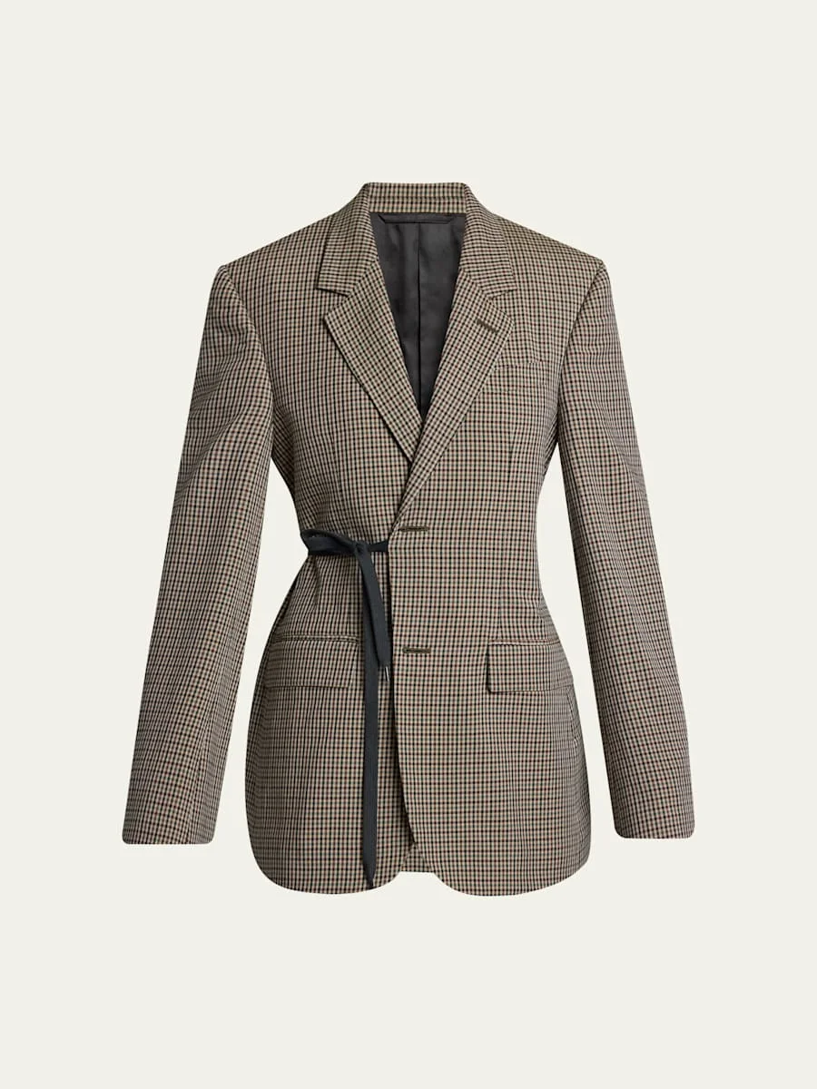 Crafted from plaid suiting, this blazer from Balenciaga features a knotted waist with selftie drawstrings Notched lapels Padded shoulders Long sleeves; button cuffs Chest welt pocket Hip flap pockets Longline silhouette Lyocell Lining: Cupro/cotton Dry clean Made in Italy SIZE amp; FITModel measurements: 5'10" tall Model is wearing a US size 4/Small