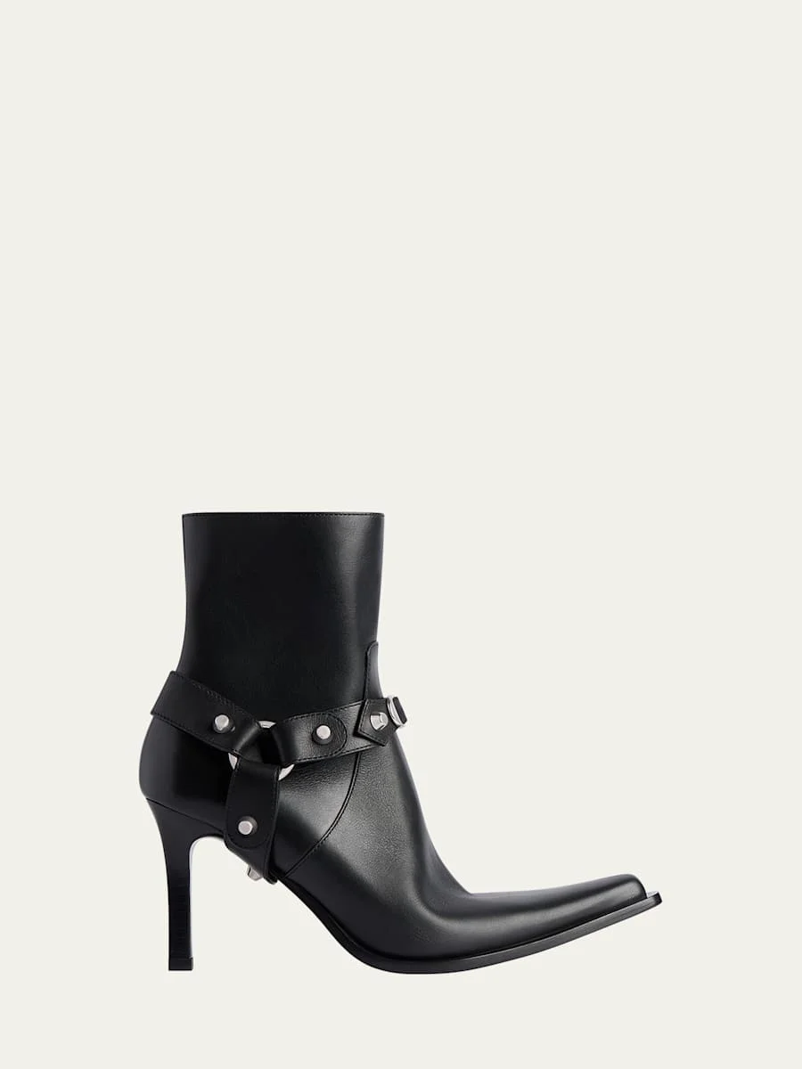 Finished with the label's signature metallic studs and hinged leather harness strap, the "City" booties by Balenciaga are crafted from smooth calf leather 3.50 in / 90 mm stiletto heel Pointed toe Side zip fastening Rubber outsole Spot clean Made in Italy