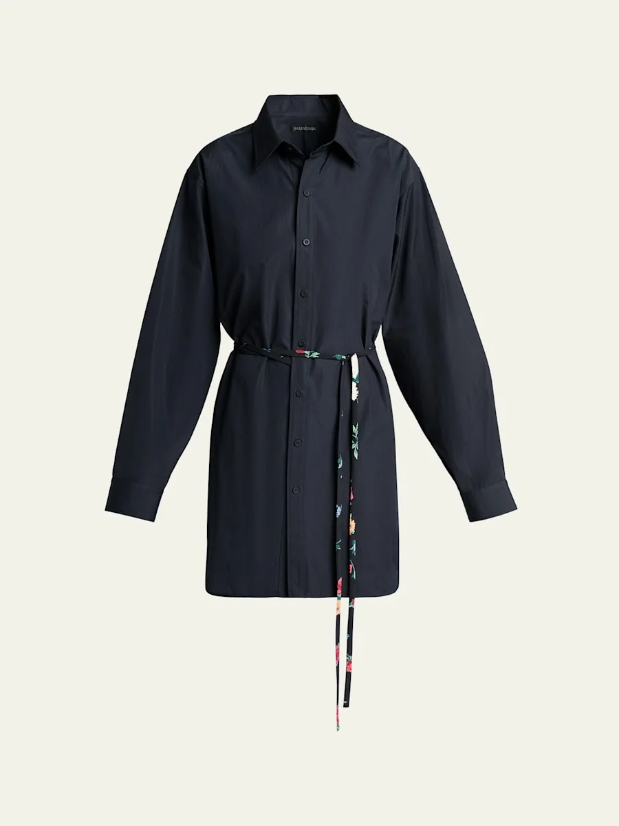 Cotton Poplin Mini Shirtdress with Floral Sash