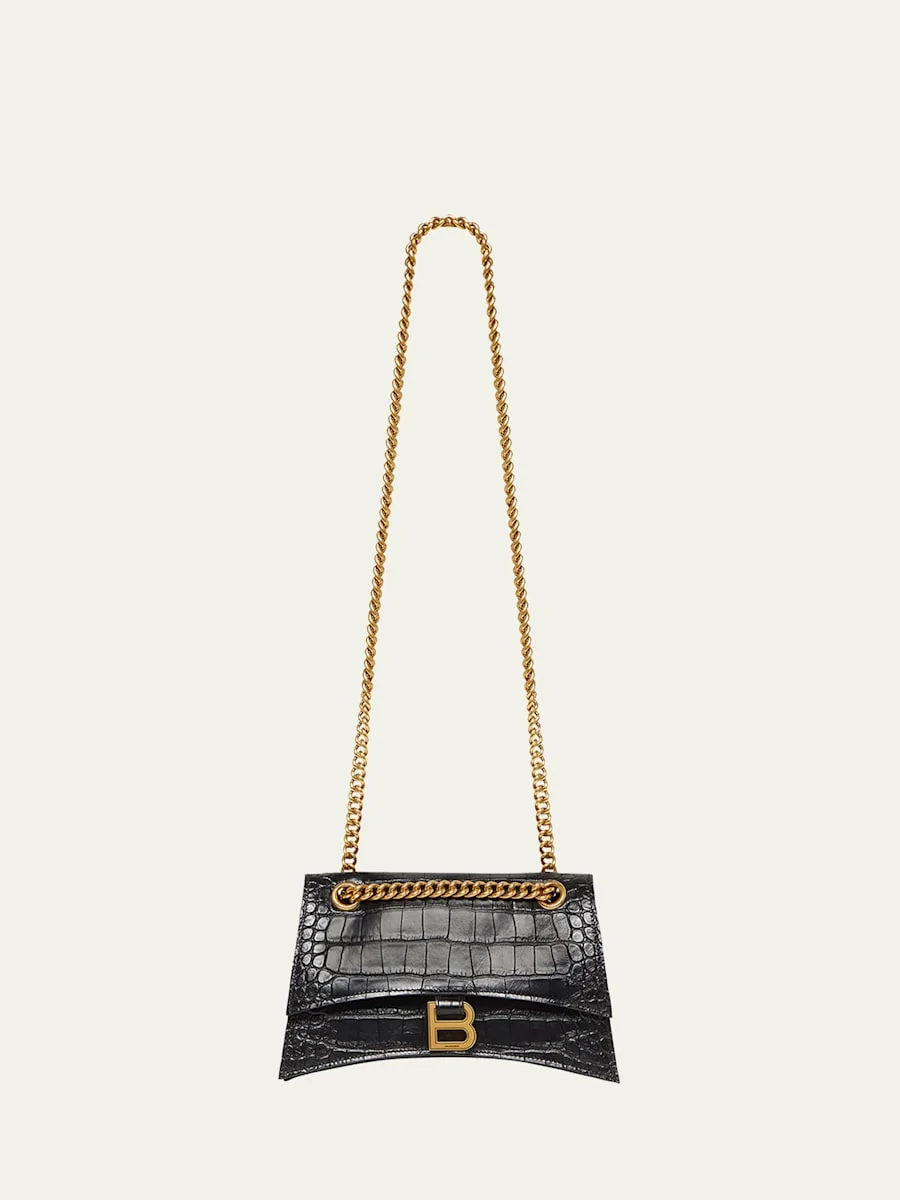 Balenciaga "Crush" shoulder bag in croc-embossed calf leather Sliding chain shoulder strap can be doubled Can be worn as a shoulder or crossbody bag Flap top with magnetic closure; signature monogram accent Exterior, curvilinear base 3 compartments; one inner zipped pocket and one inner flat pocket Napa lambskin lining Approx. 5.9"H x 9.8"W x 3.1"D Wipe clean Made in Italy Online Inquiries: BGS21_V5T93| Store Inquiries: #4502541