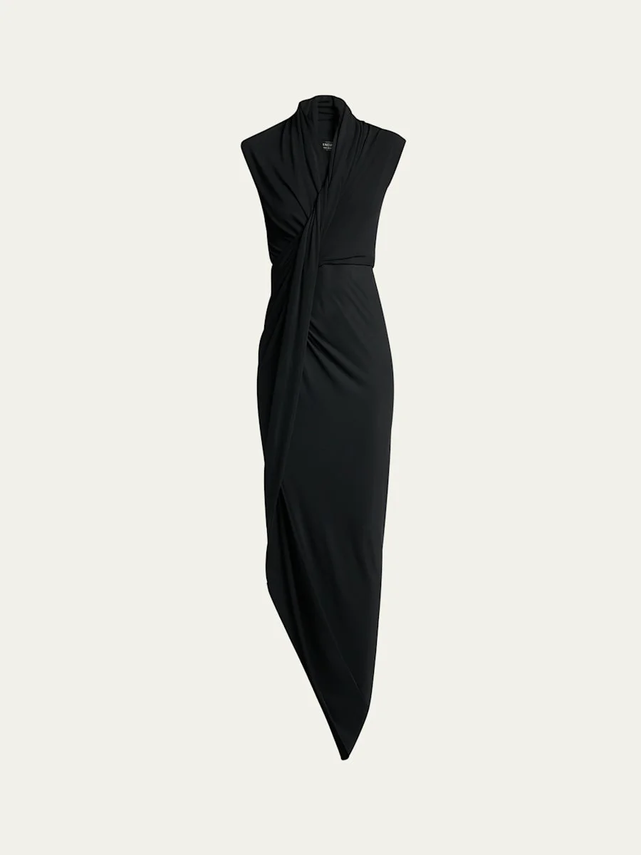 Balenciaga dress featuring a twisted draping V neckline Sleeveless Body-skimming silhouette Full length Asymmetric tulip hem Hidden closure Viscose/elastane Dry clean, professional cleaning recommended Made in France Online Inquiries: BGS21_B9UYW| Store Inquiries: #4977578