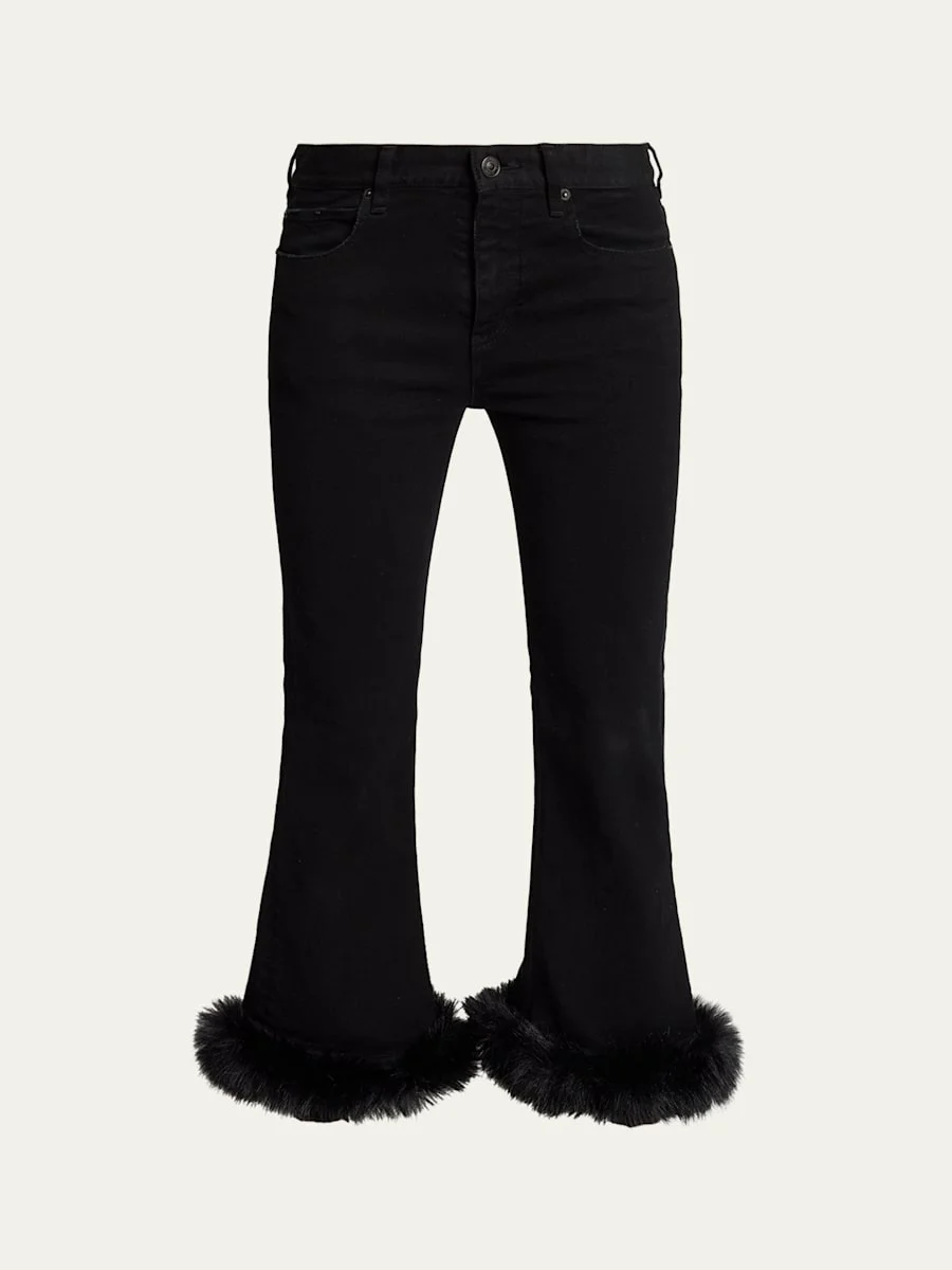 Faux-Fur Trim Denim Kickflare Capri Pants