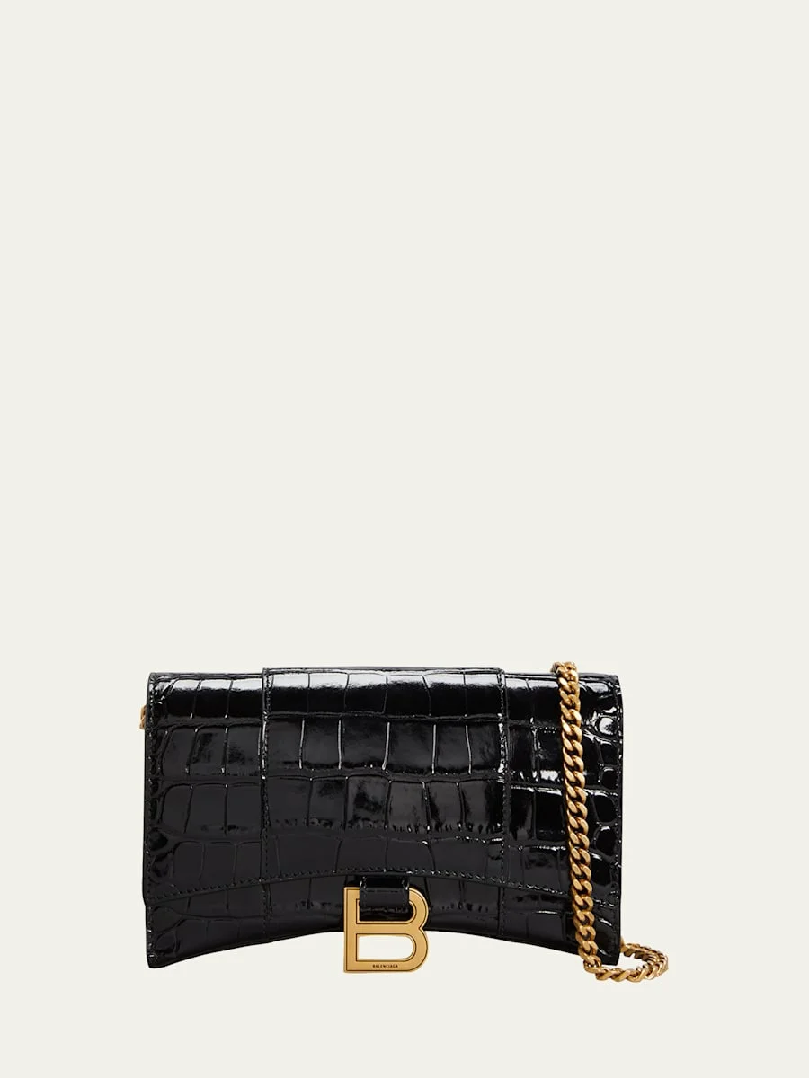Balenciaga wallet in shiny croc-embossed calf leather. Removable chain shoulder strap, 20" drop. Flap top with metal B hardware; snap closure. Exterior, one slip and one zip pockets under flap. Interior, six card slots and slip pockets. Approx. 4.7"H x 7.8"W x 2"D. Approx. weight: 1.2 lb "Hourglass" is made in Italy. Online Inquiries: BGS21_V5B8B| Store Inquiries: #4107956