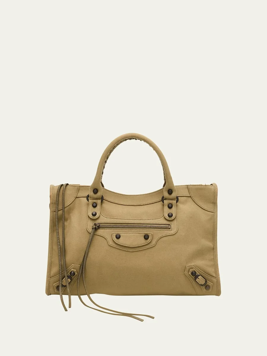 Crafted in cotton canvas, the Balenciaga "Le City" top-handle bag features whipstitching, long leather zipper pulls, and dark brass hardware Rolled top handles Adjustable, removable shoulder strap Zip top closure Exterior, one zip pocket Interior, one zip pocket Approx. 9.4"H x 15.1"W x 5.3"D Made in Italy Online Inquiries: BGS21_V6GZX| Store Inquiries: #4991280