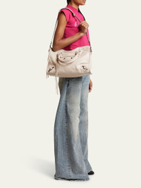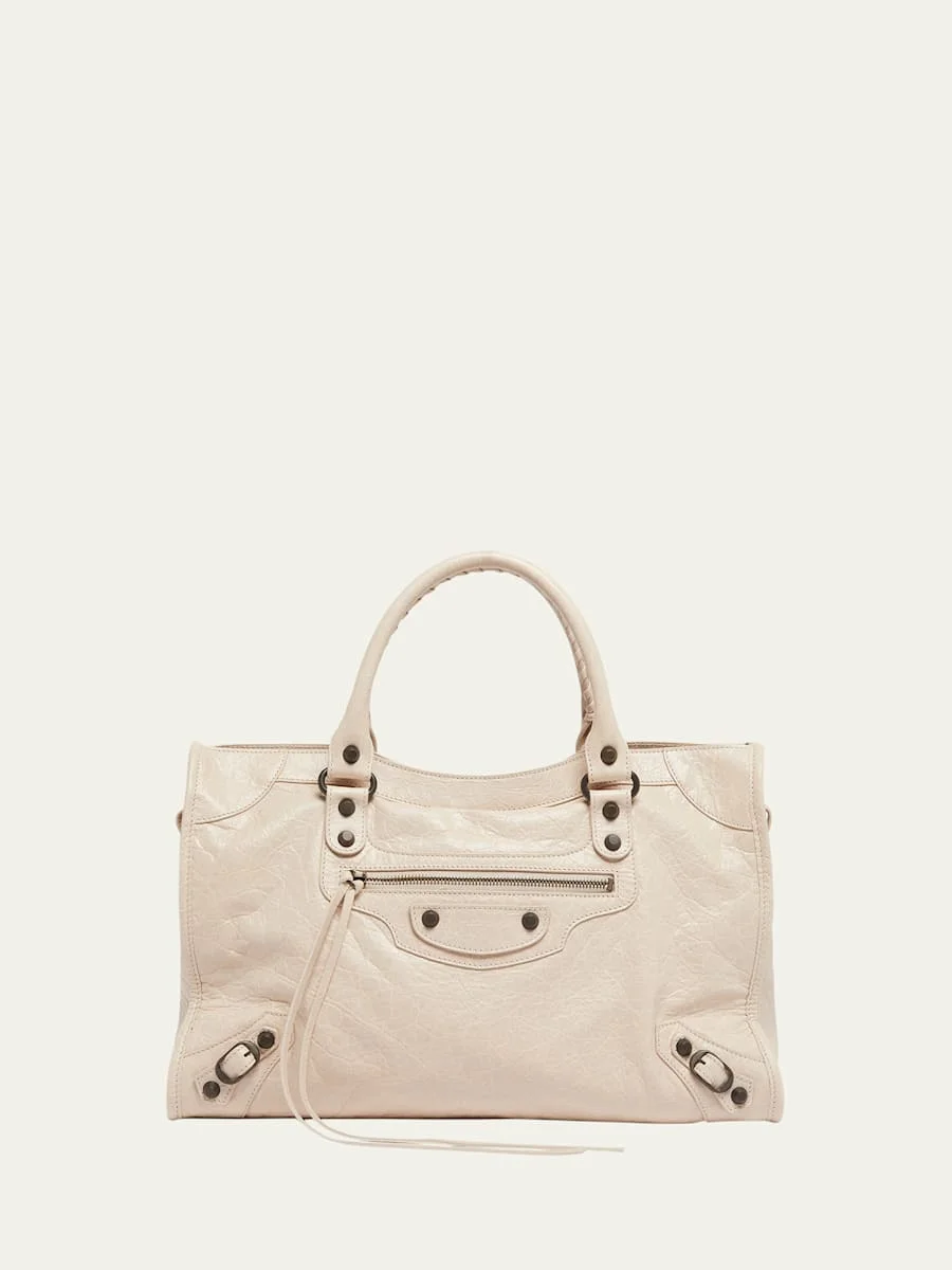 Balenciaga "Le City" top handle bag in lamb leather Rolled top handles Detachable, adjustable shoulder strap Can be worn as a top handle or shoulder bag Zip top closure Exterior, front zip pocket Interior, one zip pocket Approx. 9.2"H x 14.6"W x 5.9"D Wipe clean Made in Italy