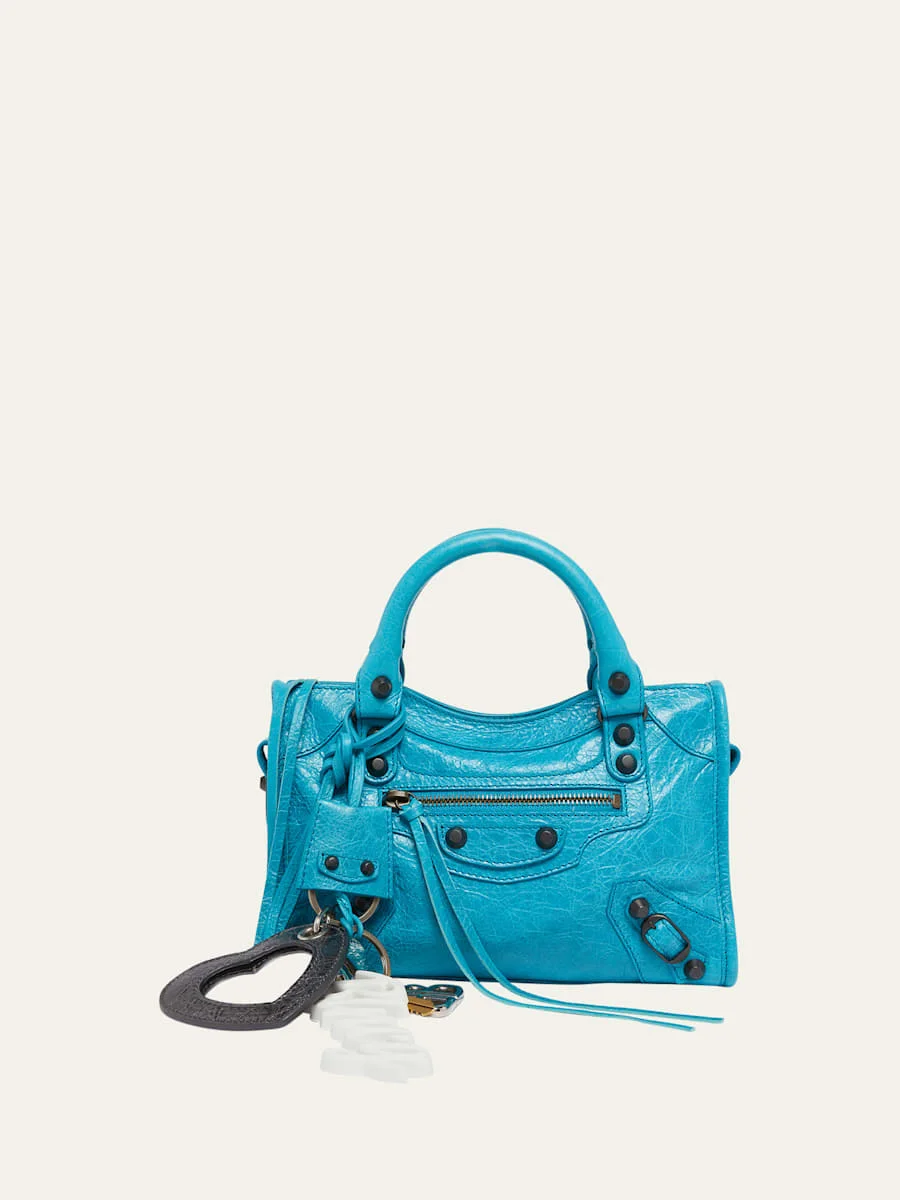 Balenciaga "Le City" top handle bag in crinkled lamb leather Rolled top handles Detachable, adjustable shoulder/crossbody strap Can be worn as a top handle or shoulder/crossbody bag Zip top closure Exterior, front zip pocket Interior, one zip pocket Approx. 6.3"H x 9.4"W x 2.5"D Wipe clean Made in Italy
