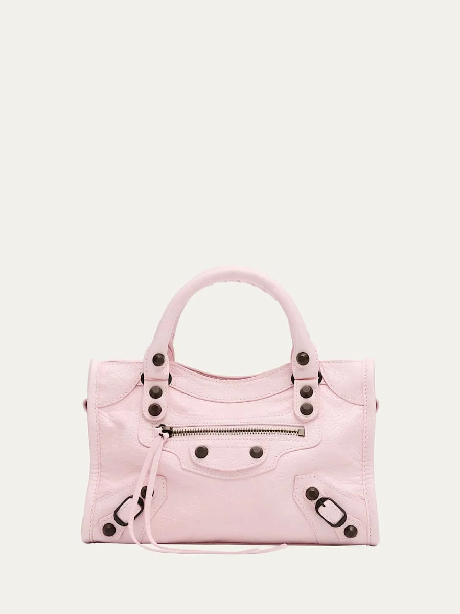 Balenciaga "Le City" top handle bag in crinkled lamb leather Rolled top handles Detachable, adjustable shoulder/crossbody strap Can be worn as a top handle or shoulder/crossbody bag Zip top closure Exterior, front zip pocket Interior, one zip pocket Approx. 6.3"H x 9.4"W x 2.5"D Wipe clean Made in Italy