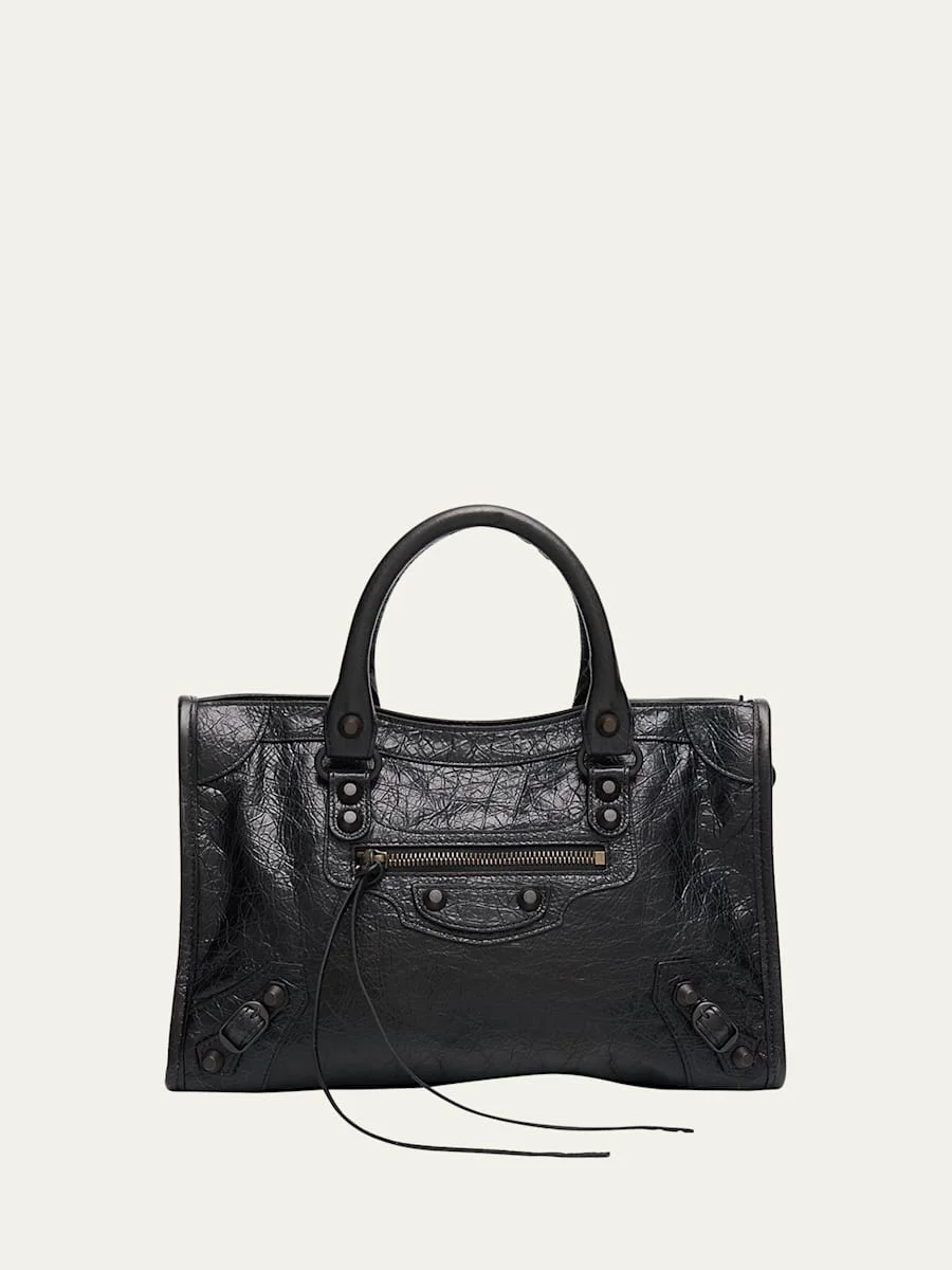 Balenciaga "Le City" top handle bag in area calfskin leather Top handles Detachable, adjustable shoulder strap, drop 10.2" Zip top closure Exterior, one zip pocket Interior, one zip pocket Nylon lining Dimensions: 9.8"L x 8.7"H x 4.7"W Made in Italy