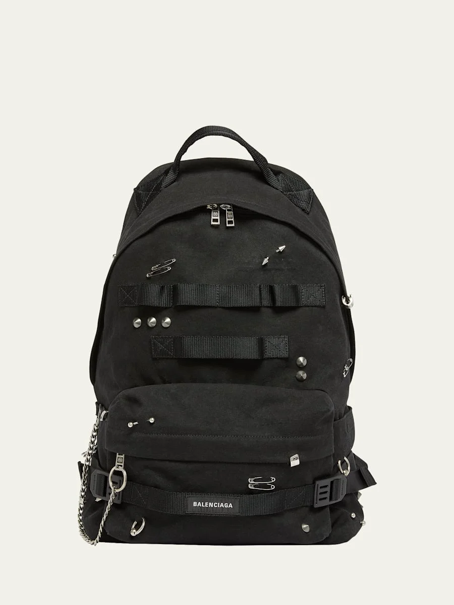 Balenciaga backpack in washed canvas accented with silvertone chain and piercing hardware Logo patch on front One top handle Adjustable shoulder straps Adjustable chest strap Two-way zip closure Exterior, one front zip pocket Interior, one flat pocket Nylon lining BB engraved zip pulls Approx. 20.4"H x 13.7"W x 8.2"D Made in Italy Online Inquiries: BGS21_NDMPH| Store Inquiries: #5049824