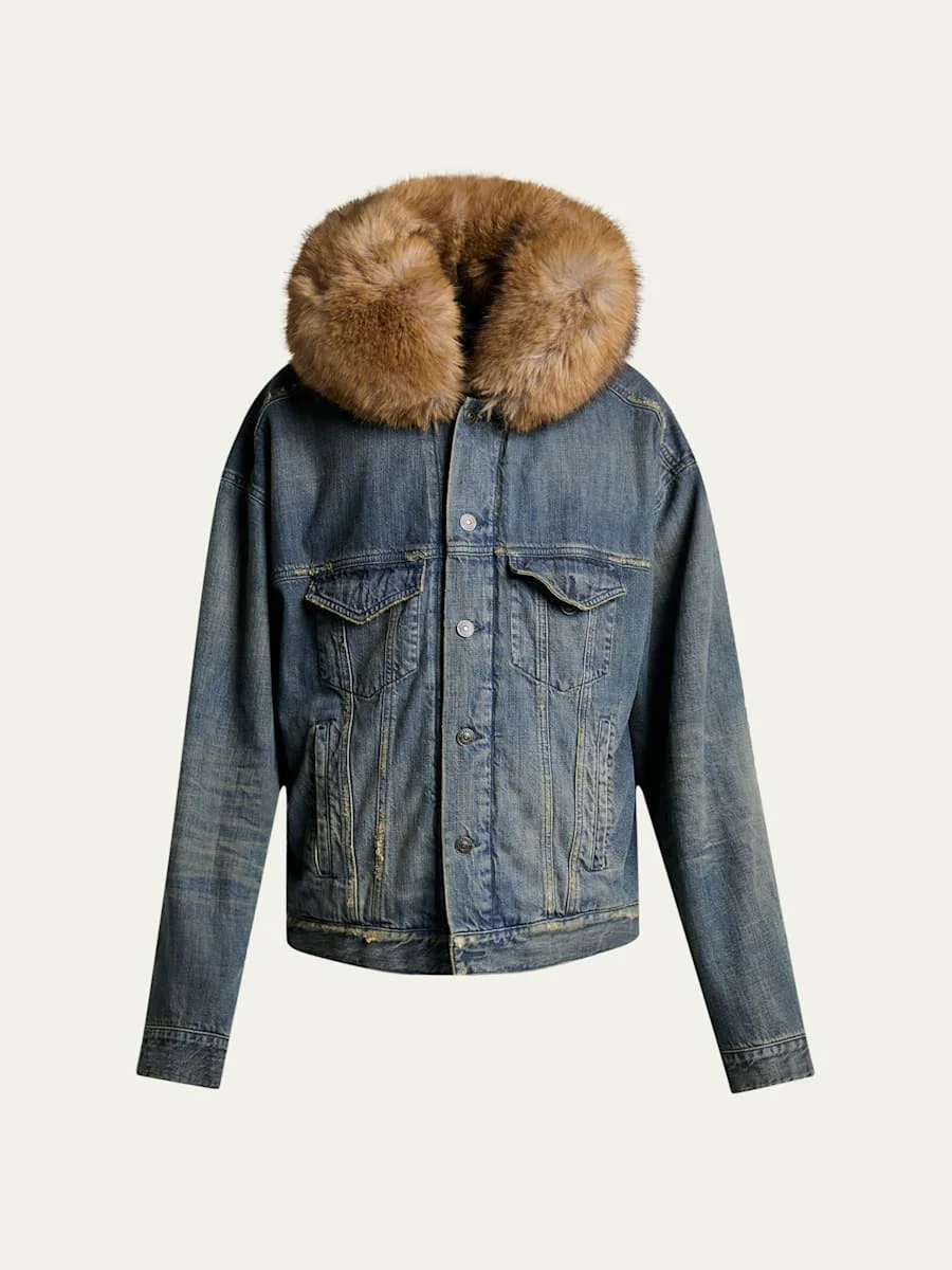Men's Faux Fur-Trim Hooded Denim Trucker Jacket