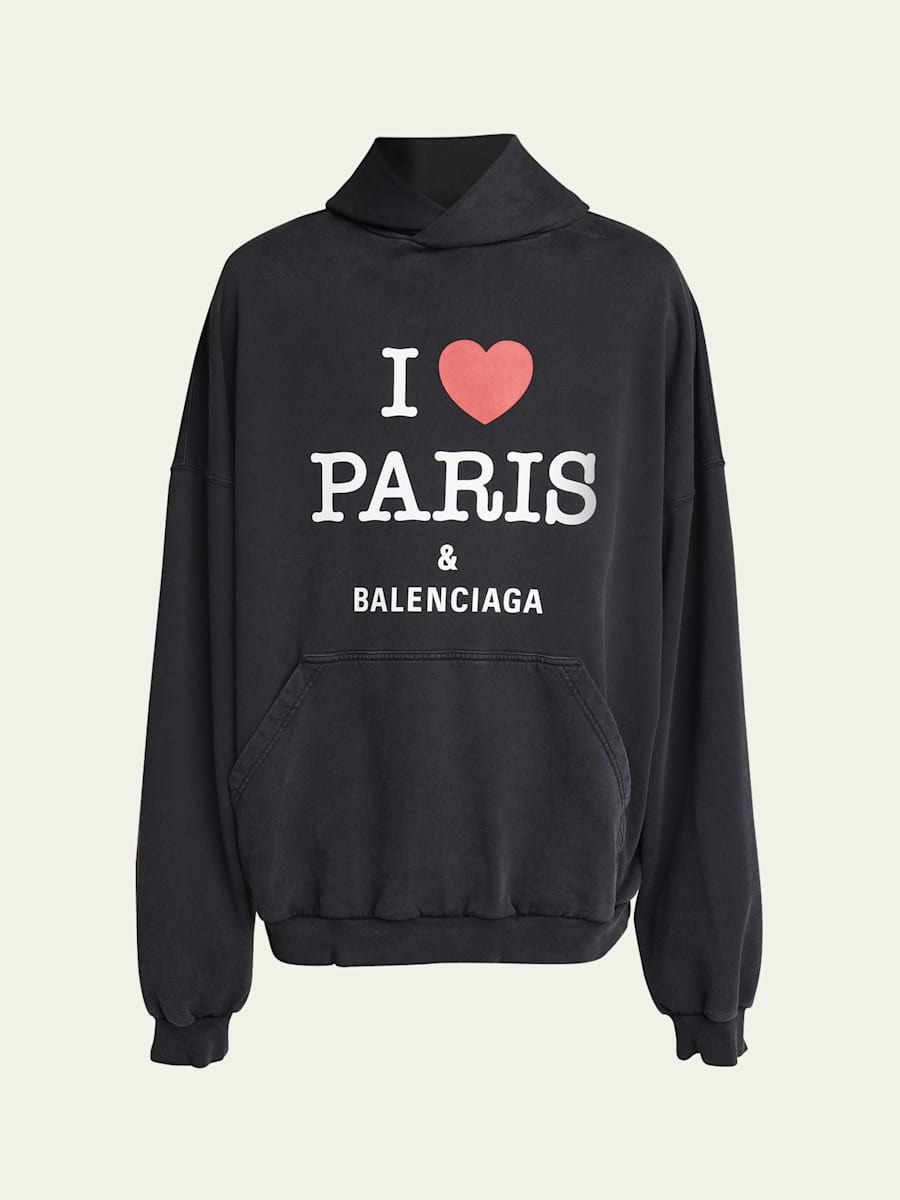 Balenciaga hoodie in faded terry "I Love Paris" print on front Fixed hood Pouch pocket Oversized fit Long sleeves Banded cuffs and hem Pullover style Cotton Dry clean Made in Portugal