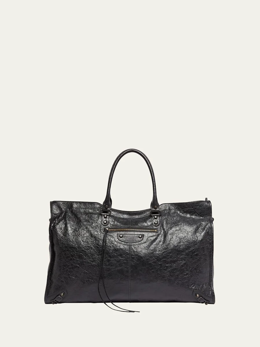 Balenciaga "Le City" travel bag in Arena lambskin Two leather hand-braided handles; 7.9" drop Adjustable and removable shoulder strap; 19.7" drop Zip closure with knotted leather puller Exterior, one front zip pocket Interior, one main compartment, one zip pocket Cotton canvas lining Brass hardware Approx. 13.8"H x 21.6"W x 7.9"D Made in Italy Online Inquiries: BGS21_NCT1S| Store Inquiries: #4946663