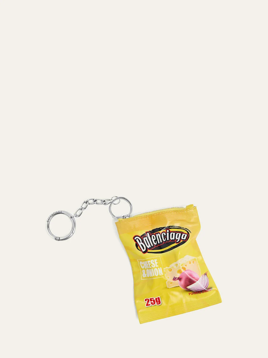 Balenciaga keyring Chips charm in glossy calfskin leather Chips artwork printed on the front and back Logo printed on the upper part of the lining One main zipped compartment TPU mirror lining Agedsilvertone hardware Multiple logoengraved keyrings to attach on the bag or be used as a keyring Made in Italy