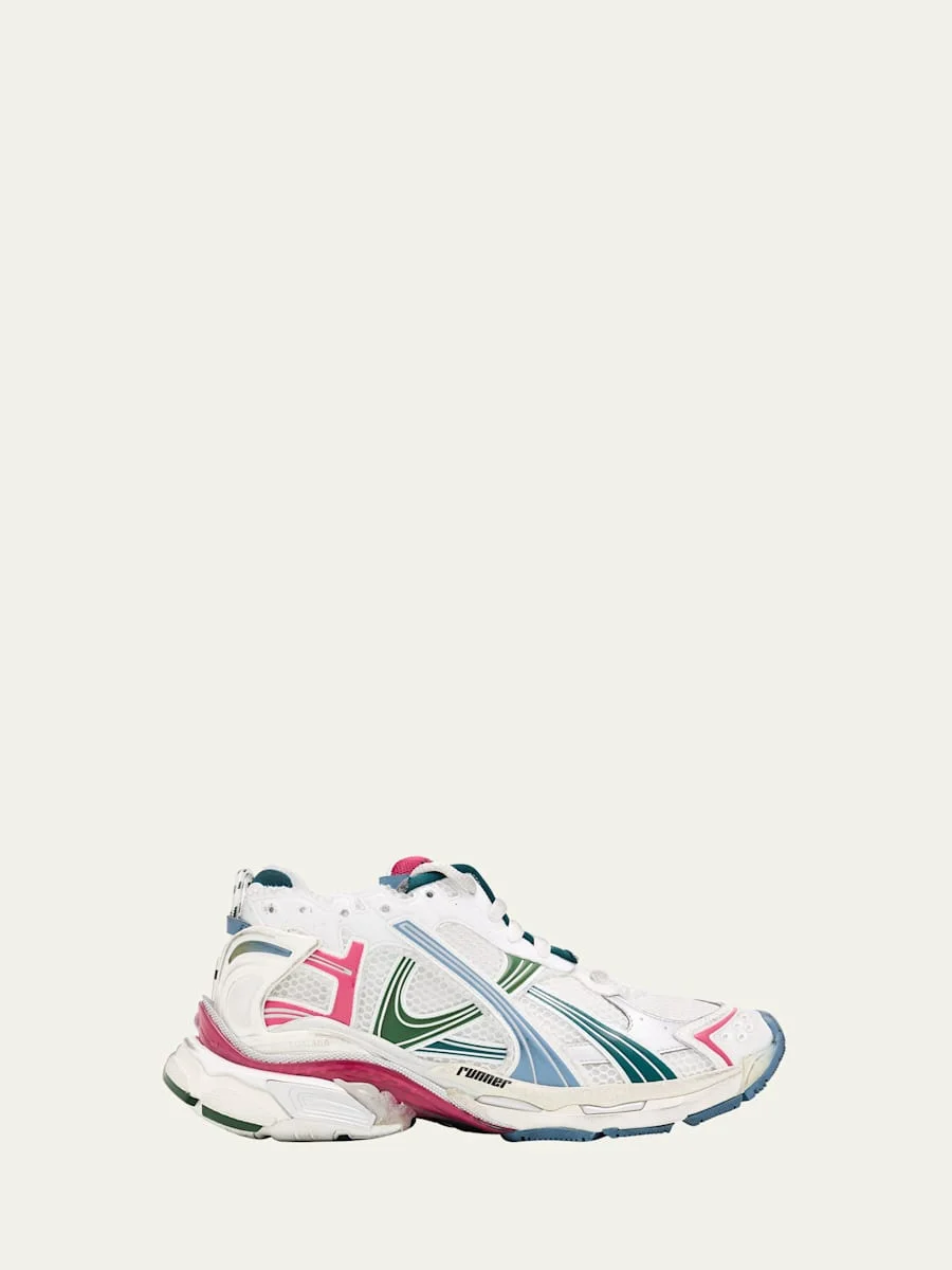 Balenciaga "Runner" sneakers in mesh fabric with a worn-out effect Chunky heel Reinforced round toe Lace-up vamp Embroidered logo on the tongue Padded collar Pull tab at the backstay Logo at the vamp and heel Branding on the side Rubber outsole Wipe clean Imported Online Inquiries: BGS21_NBDW5| Store Inquiries: #4631114