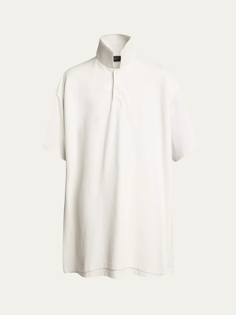 Balenciaga polo shirt featuring an oversized silhouette with double-layer front Stand collar Two-button placket Tonal logo embroidery at chest Short sleeves Pullover style Cotton/polyester Dry clean Made in Portugal Model is 6'1"/185cm. Online Inquiries: BGS21_NCRJ2| Store Inquiries: #4936186