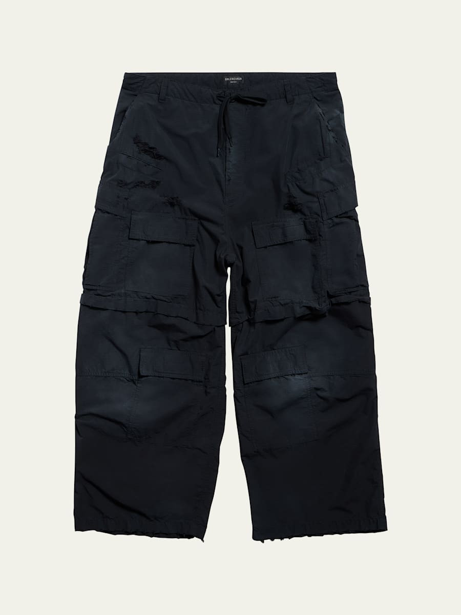 Balenciaga cargo pants crafted of lightweight, durable ripstop Destroyed, washed-out and stained effect Regular rise Zip fly with drawstring fastening One cargo pocket on each side Four hook and loop patch pockets at front Two hook and loop pockets at back Zip-off legs convert pants to shorts Baggy fit Cotton Dry clean Made in Italy Model is 6'1"/185cm. Online Inquiries: BGS21_NCCUG| Store Inquiries: #4855724