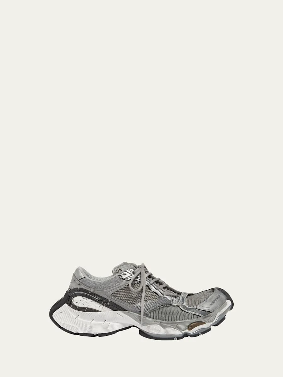 Balenciaga "Stapler" runner sneakers in mesh fabric and faux leather (polyurethane) with a wornout effect Chunky heel Reinforced round toe Laceup vamp Logo on the tongue Pull tab at the backstay Logo at the vamp and heel Rubber outsole Wipe clean Imported
