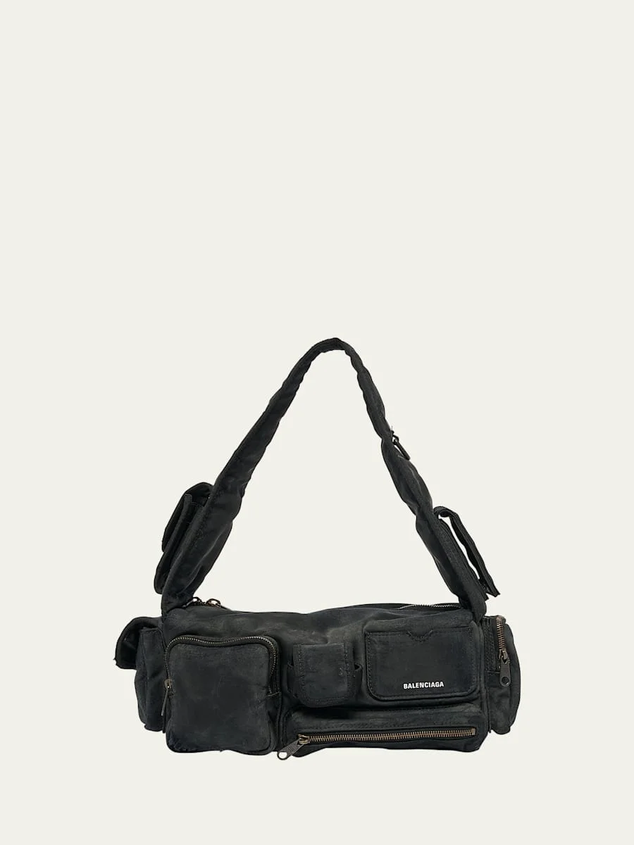 Balenciaga "Superbus" sling bag in distressed nylon Shoulder strap with a logo-engraved hook; 11" drop Logo embossed on the front Two-way zip closure BB logo engraved zip pull Exterior, two pockets on the strap, two front zip pockets, one front earpods compartment, one front card holder, one side flap pocket, one side zip pocket, one back zip pocket, one back hook Cotton canvas lining Aged-gold hardware Approx. 5.1"H x 14.5"W x 4.7"D Wipe clean Made in Italy Online Inquiries: BGS21_NCAN2| Store Inquiries: #4843950