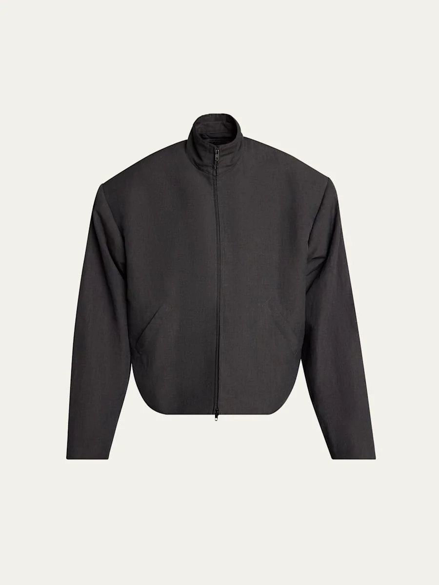 Balenciaga tailored tracksuit jacket Stand collar; tao-way zip front Long sleeves Padded shoulders Hip welt pockets Oversized fit Linen/cotton Lining: Cotton/cupro Hand wash, machine wash line dry Made in Italy Online Inquiries: BGS21_BA8KN| Store Inquiries: #5053470
