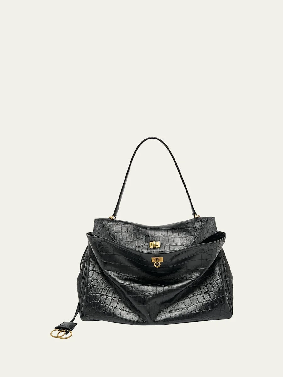 Balenciaga "Rodeo" top handle bag in croc-embossed leather Shoulder strap with keyring tag Can be worn as a top handle or shoulder bag Fold-over flap top with turn-lock closure Exterior, two back slip pockets Feet protect bottom of bag Approx. 11.8"H x 15.7"W x 5.1"D Made in Italy Online Inquiries: BGS21_V6ANH| Store Inquiries: #4857729