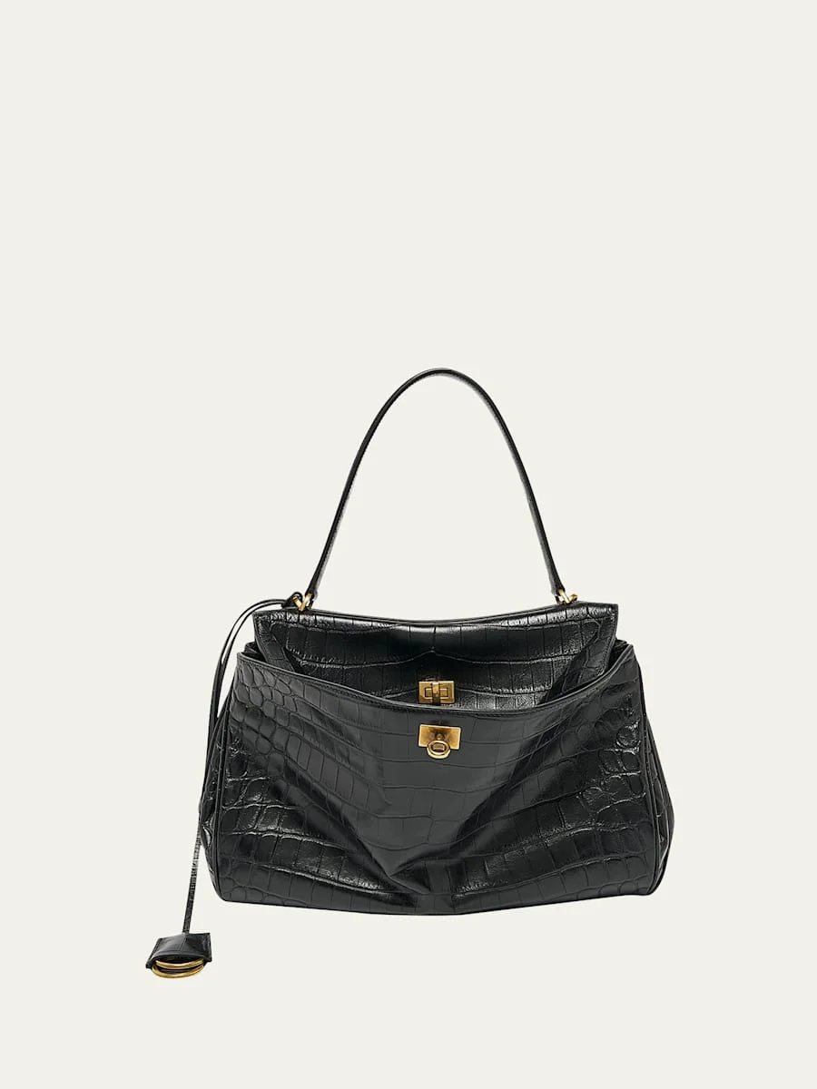 Balenciaga "Rodeo" top handle bag in croc-embossed leather Top handle with keyring tag Removable, adjustable shoulder strap Can be worn as a top handle or shoulder bag Fold-over flap top with turn-lock closure Exterior, two back slip pockets Interior, one zip pocket Approx. 9.2"H x 13.8"W x 4.3"D Made in Italy Online Inquiries: BGS21_V6A50| Store Inquiries: #4851354