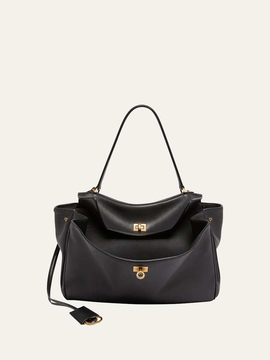 Balenciaga "Rodeo" top handle bag in smooth leather Top handle with clochette tag Fold-over flap top with turn-lock closure; side snap closures Exterior, two slip pockets Divided interior Approx. 9.5"H x 13.6"W x 4.5"D Wipe clean Made in Italy Online Inquiries: BGS21_V67V4| Store Inquiries: #4787948