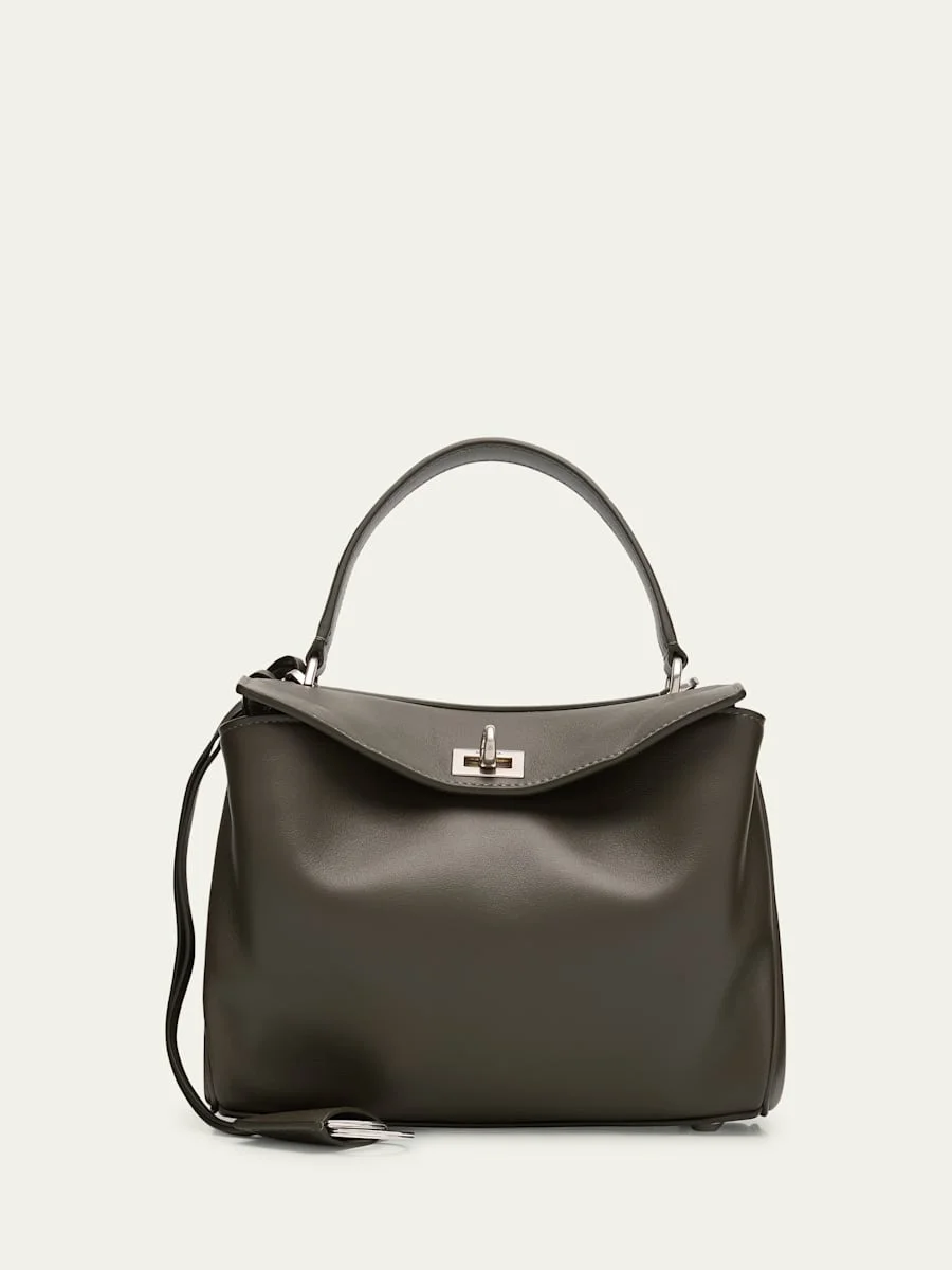 This Balenciaga "Rodeo" tophandle bag is crafted of smooth leather, designed for a roomy interior and versatile styling Flat top handle, 4.7" drop Detachable shoulder strap, 16.7" drop Can be worn as a top handle or shoulder bag Flap top with turnlock closure Side snaps for versatile shaping Detachable leather tag with two key rings Exterior, two back slip pockets Divided interior, one slip pocket Nappa lambskin leather lining Feet protect the bottom of the bag Approx. 6.7"H x 9"W x 3.9"D Made in Italy