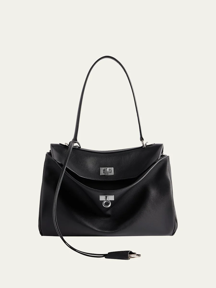 Balenciaga "Rodeo" top handle bag in smooth calfskin leather Shoulder strap with keyring tag Foldover flap top with turnlock closure Exterior, two back slip pockets Approx. 7.9"H x 11.4"W x 3.9"D Wipe clean Made in Italy