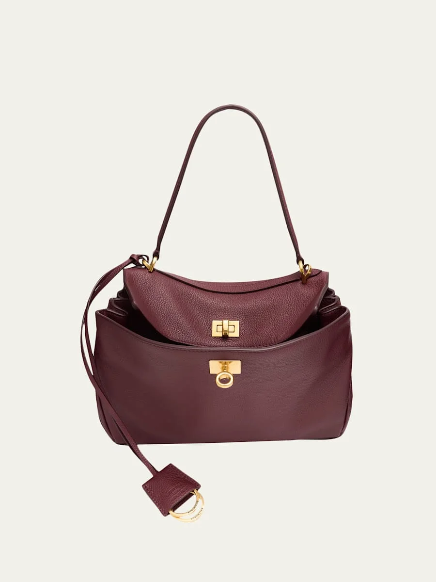 Balenciaga "Rodeo" top handle bag in grained leather Top handle with clochette tag Foldover flap top with turnlock closure; side snap closures Exterior, two slip pockets Divided interior; one zip pocket Feet protect bottom of bag Approx. 10.6"H x 7.9"W x 7.9"D Made in Italy