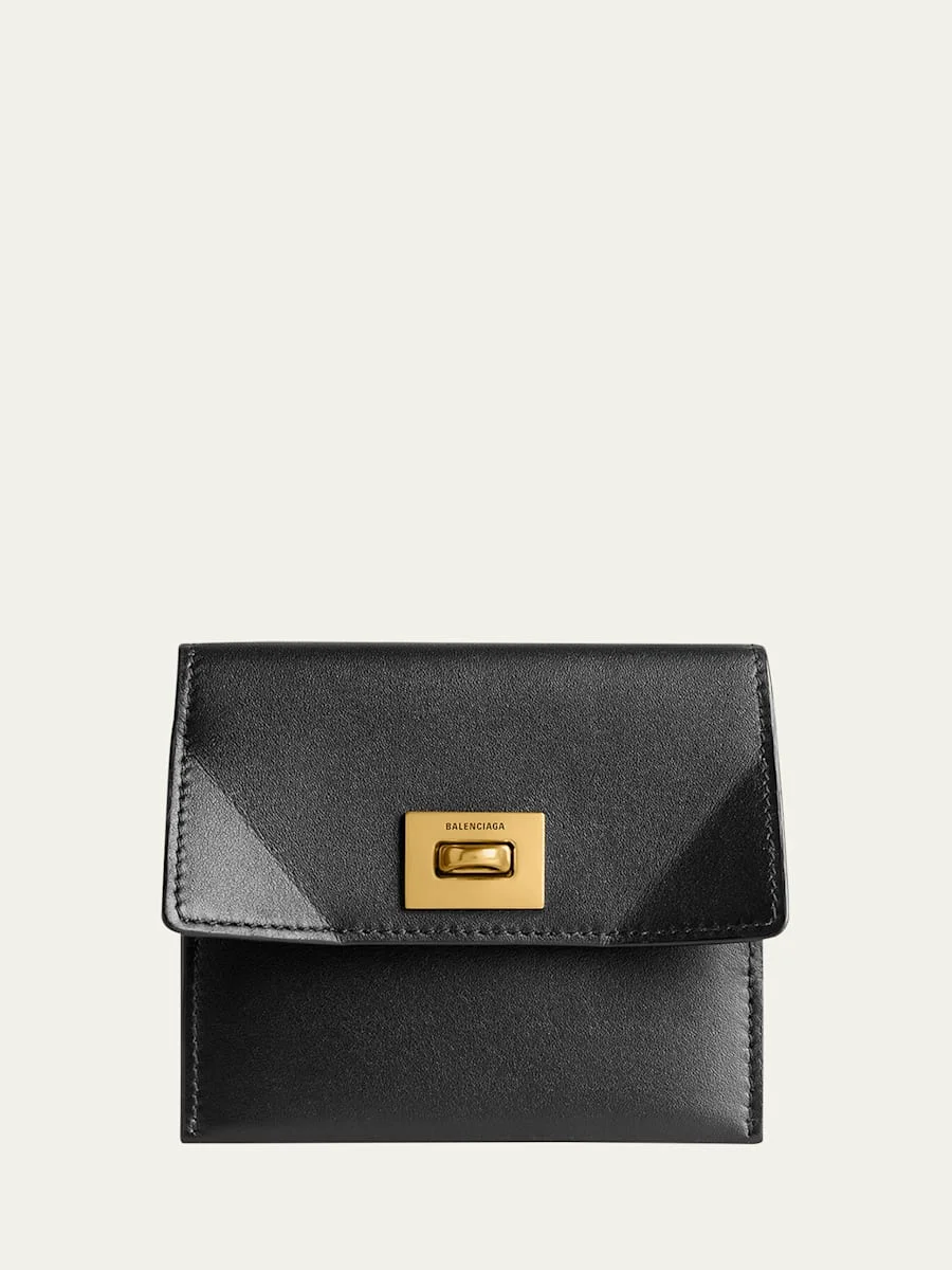 Balenciaga "Rodeo" card holder crafted in smooth calfskin leather with aged goldtone hardware Flap top with turnlock closure Exterior, three card slots Interior, two card slots and one bill compartment Approx. 3.5"H x 3.9"W x 0.4"D Made in Italy