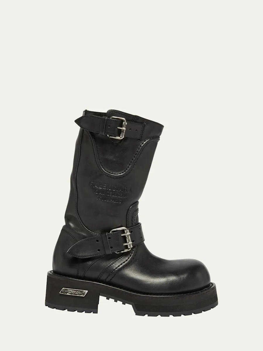 Balenciaga "Venom" moto boots in smooth calf leather with embossed side logo Chunky heel Round toe Buckle straps at ankle and collar Pull-on style Rubber outsole Lining: Unlined Made in Italy Online Inquiries: BGS21_X6YB6| Store Inquiries: #5051496