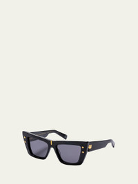 Balmain "B-Eye" cat-eye sunglasses in acetate with golden hardware Lens/bridge/temple (in mm): 54-18-145 Solid lenses Saddle nose bridge B-monogram on temples Thin, tapered arms Spot clean 100% UVA/UVB protection Made in Japan Proposition 65 warning for California residents Online Inquiries: BGS21_D4Y3F| Store Inquiries: #4812879