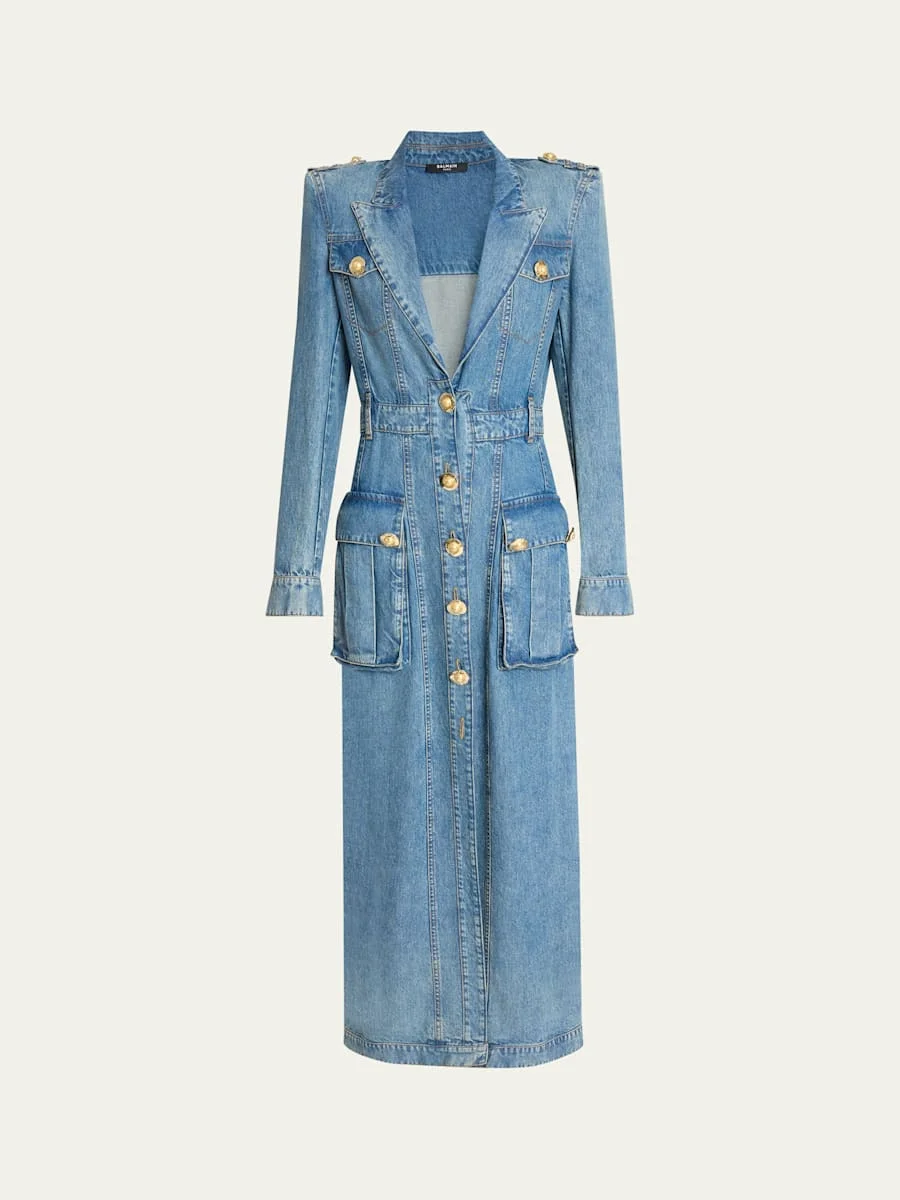 Balmain denim blazer dress featuring signature goldtone buttons and padded shoulders with epaulets Plunging peak lapels Single-breasted front Long sleeves with button cuffs Chest flap pockets; hip flap pockets Belt loops along the waist Column silhouette Hem falls below the knee Center-back vented hem Button closure Lyocell Professional cleaning recommended Made in Italy Online Inquiries: BGS21_B9YWB| Store Inquiries: #5009100
