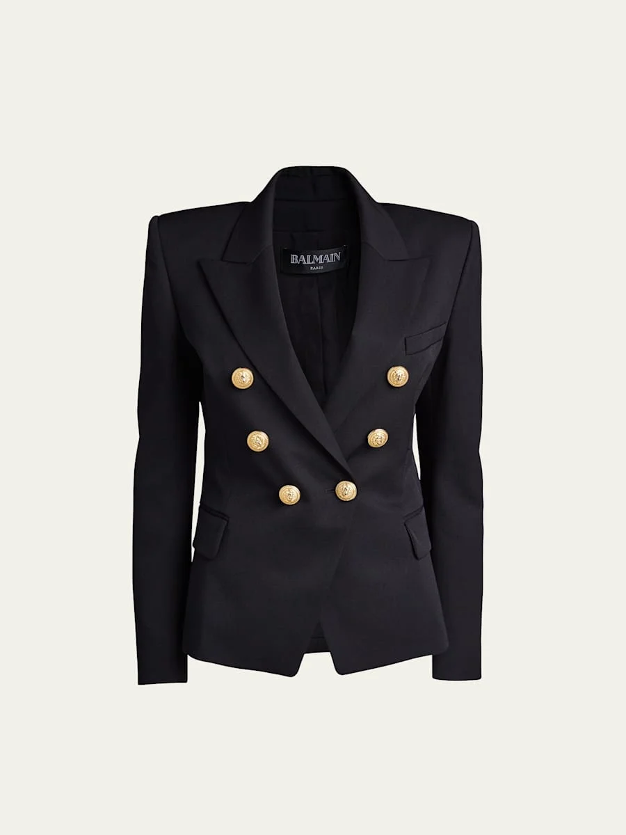 Balmain gabardine blazer. Runs small; order size up Approx. length: 24" (size 40 FR) Peaked lapels; asymmetric double-breasted button front. Long sleeves with button cuffs. One welt pocket at chest. Two flap pockets at hips. Fitted silhouette. Cutaway hem. Wool. Dry clean Made in France. Model is 5'10"/177cm. Online Inquiries: BGS21_TSLGH| Store Inquiries: #1660410