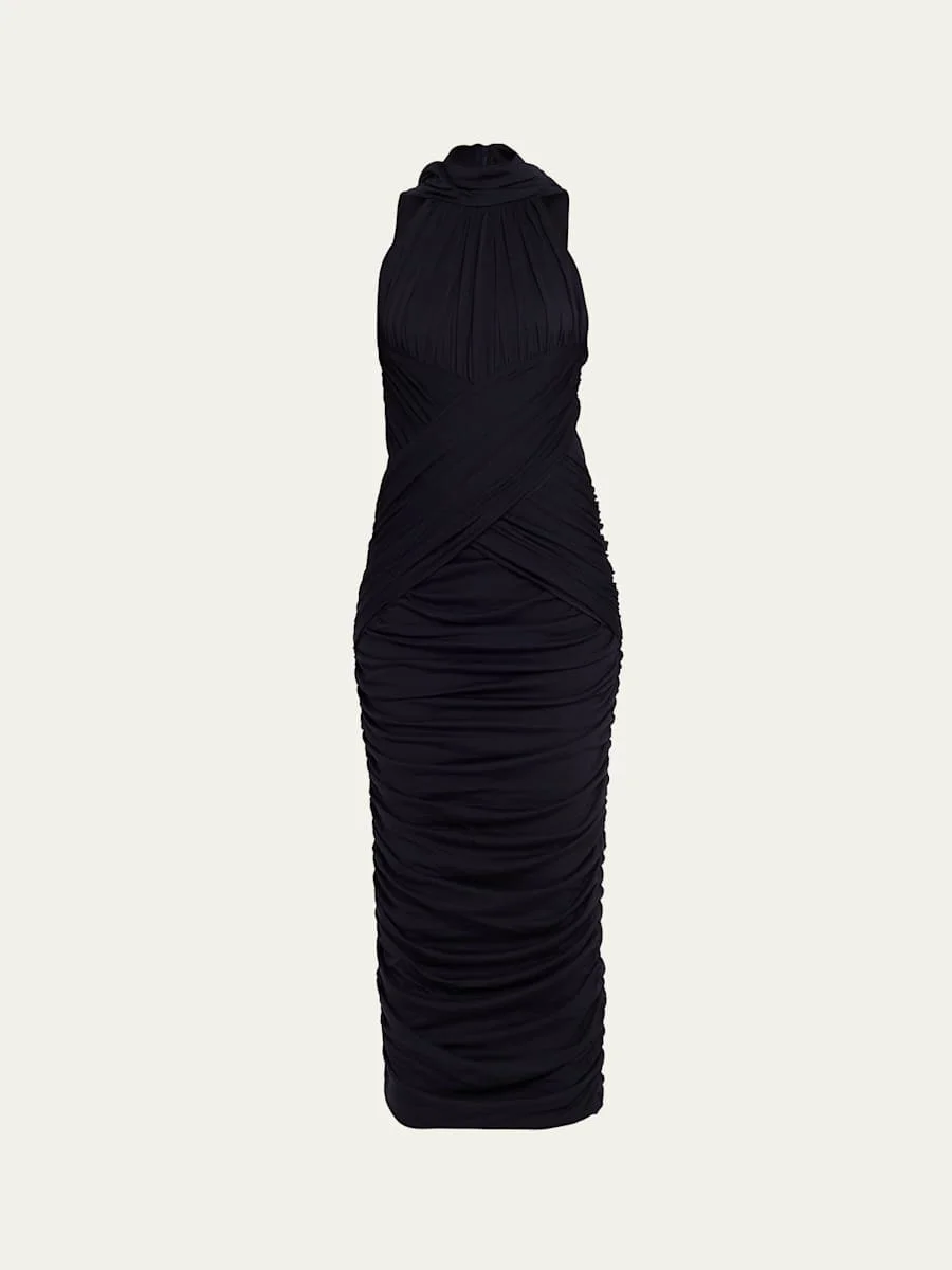 Balmain dress is crafted of wool jersey, draped with a figure-flattering crisscross waist detail Halter neckline Sleeveless Body-skimming silhouette Hem falls below the knee Invisible back zip Wool Professional cleaning recommended Made in Portugal Online Inquiries: BGS21_BAKKH| Store Inquiries: #5176916