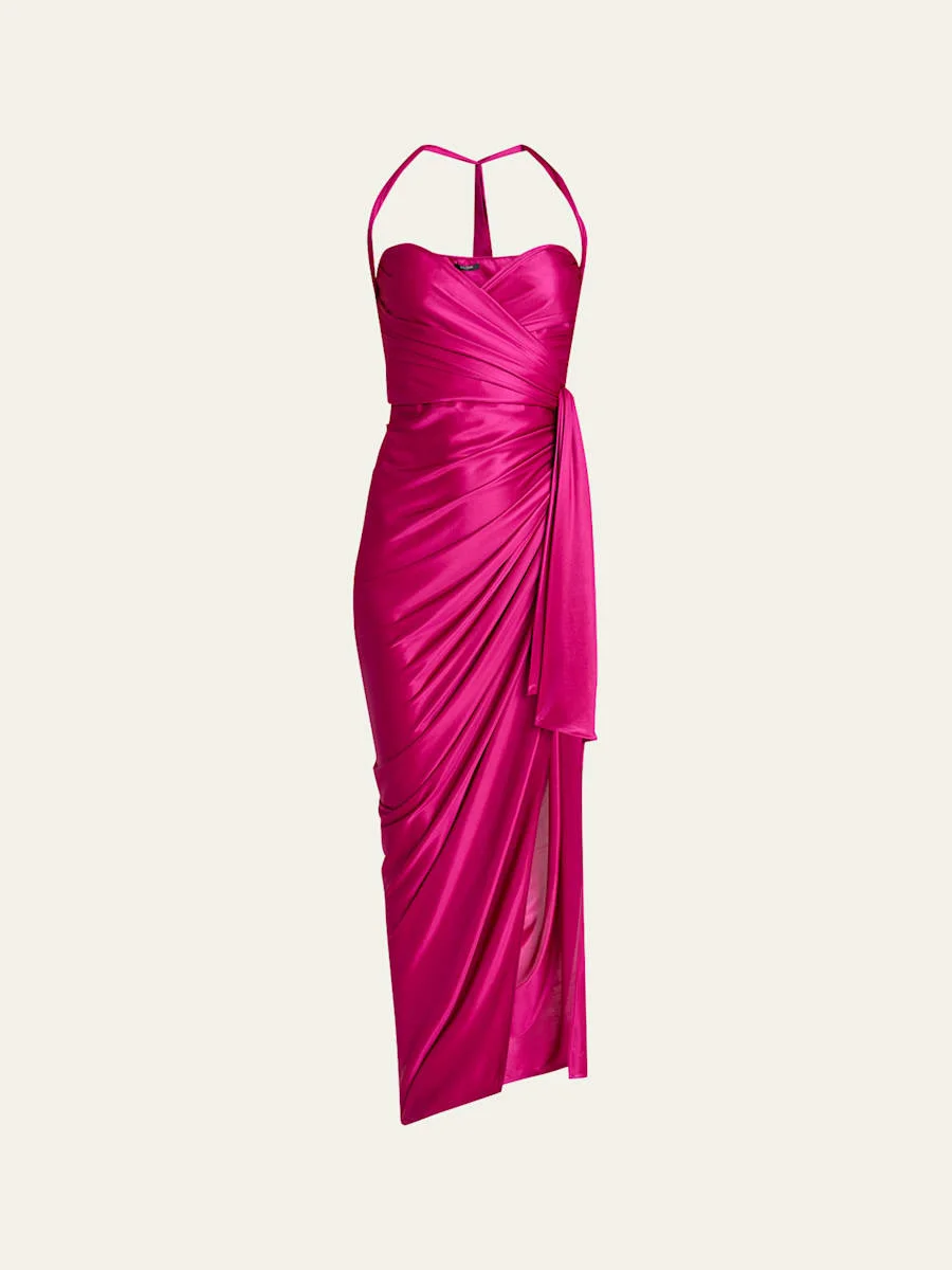 Balmain dress fetauring interlocking draping with a waist drape panel and a thigh slit Sweetheart neckline; self-tie halter back Sleeveless Sheath silhouette Full length Side slit hem Zip closure Viscose Made in France Online Inquiries: BGS21_B9YU5| Store Inquiries: #5008973