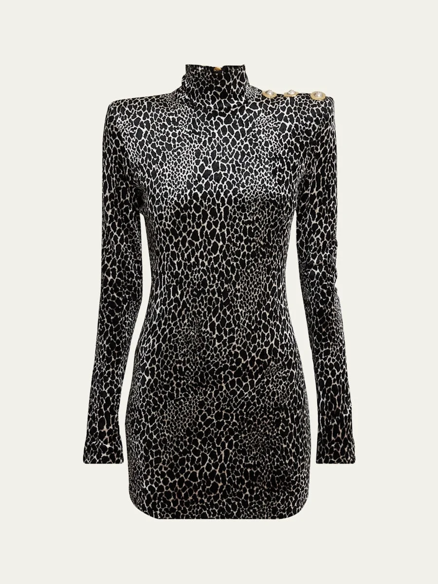 Balmain leopard velvet dress featuring signature mixed-metal button shoulder detail Tutleneck Long sleeves Padded shoulders Body-conscious silhouette Mini length Back zip Viscose/cotton Professional cleaning recommended Made in Bulgaria Online Inquiries: BGS21_B9YU8| Store Inquiries: #5008976