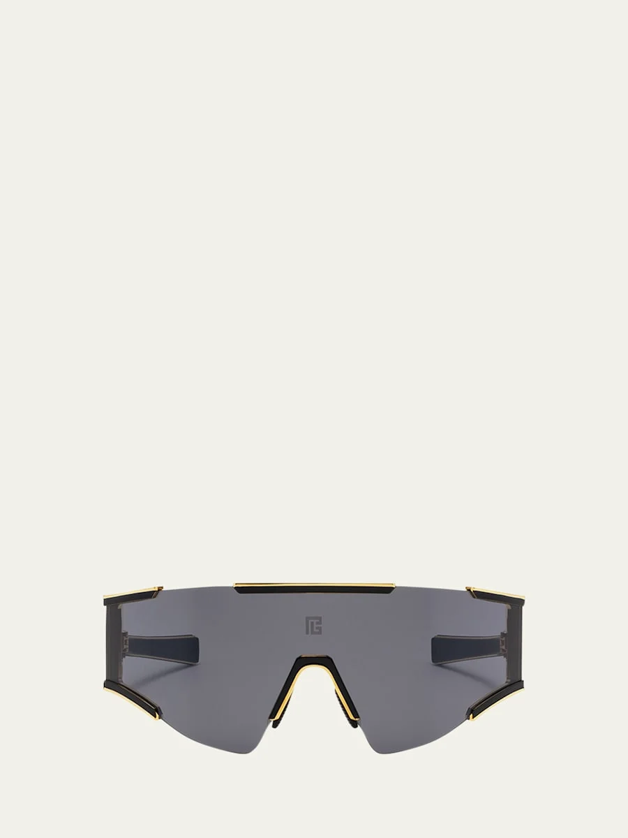 Balmain shield sunglasses in titanium and acetate Lens/bridge/temple (in mm): 141-0-118 Mirror lenses; logo accent Adjustable nose pads Logo accent on hinges Engraved monogram on temples Thin, tapered arms 100% UVA/UVB protection Made in Japan Online Inquiries: BGS21_D4HQ7| Store Inquiries: #4456965