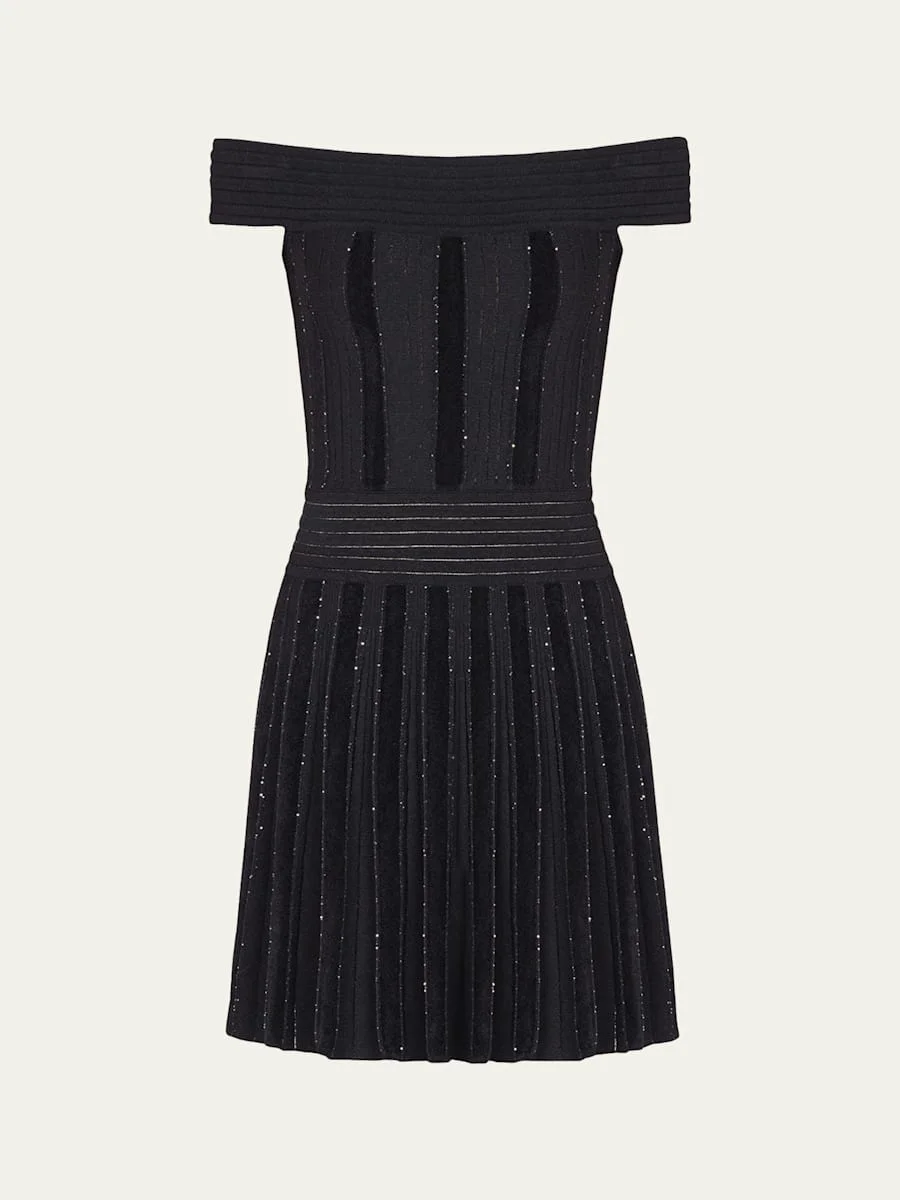Off-The-Shoulder Metallic Velvet Pleated Knit Mini Dress