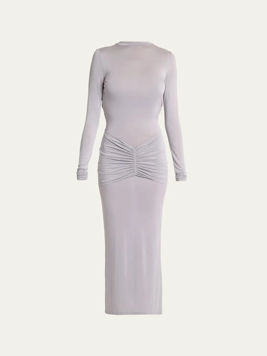 Balmain dress is crafted of a stretch jersey with figureflattering waist ruching and features an open back cutout adorned with goldtone chain detail Round neckline Long sleeves Bodyskimming silhouette Ankle length Invisible side zip Cupro/elastane Professional cleaning recommended Made in Portugal