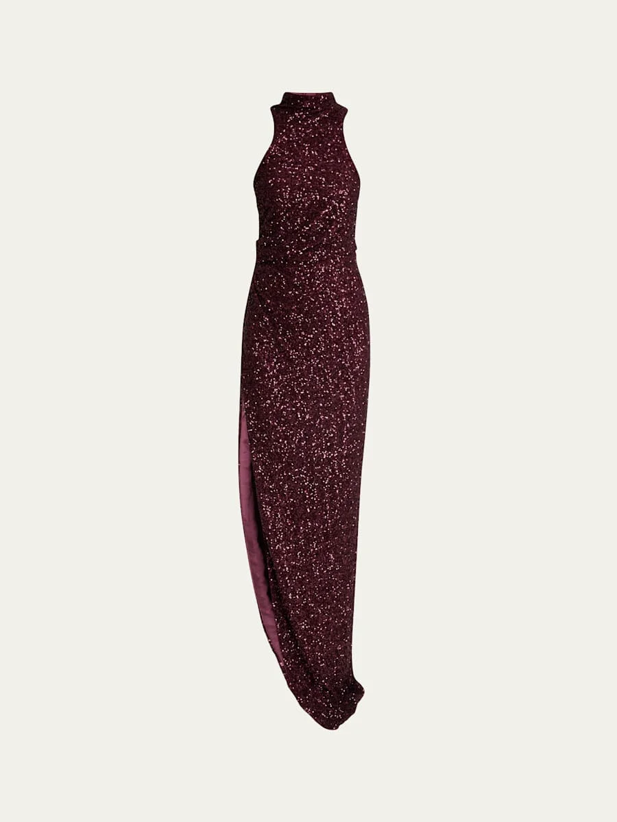 All-over sequin embellished dress by Balmain. Halter neckline Sleeveless Draped silhouette Thigh-high slit Exposed center back zip Cupro Professional cleaning recommended Made in France Online Inquiries: BGS21_BAZUQ| Store Inquiries: #5359433