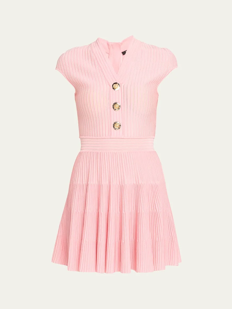 Balmain flechage knit dress featuring goldtone novelty buttons and a tiered skirt V neckline Short sleeves Fit-and-flare silhouette Mini length Back zip Nylon/polyamide/polyester Professional cleaning recommended Made in Italy Online Inquiries: BGS21_B9YV7| Store Inquiries: #5009005