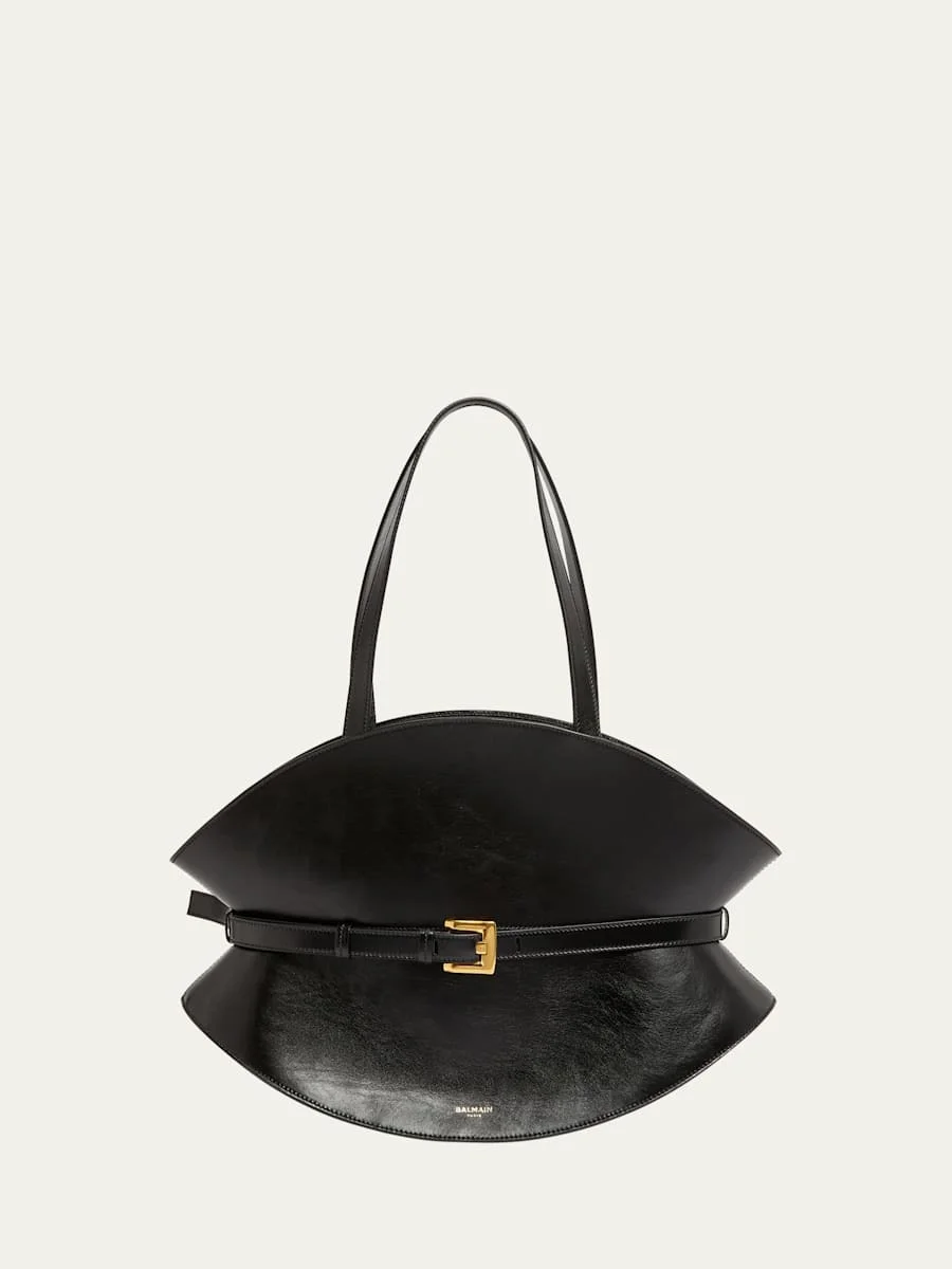 Balmain "Shuffle" calfskin leather structured shoulder with belted center Shoulder straps Open top Interior, one slip pocket, one card slot Approx. 12.6"H x 18.9"W x 6.7"D Spot clean Made in Italy