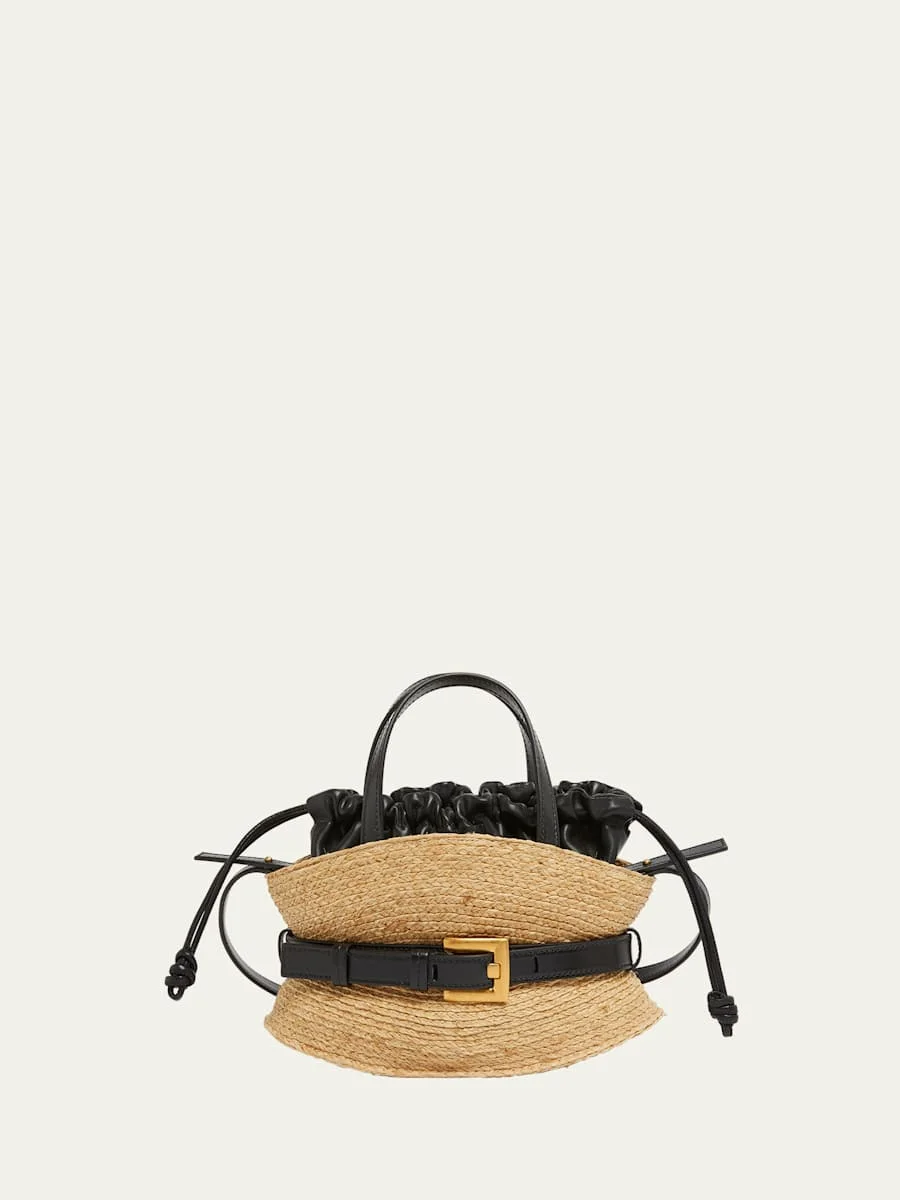 Balmain "Shuffle" raffia and calfskin leather top handle bag with center buckle accent Top handles Detachable, adjustable shoulder strap Can be worn as a top handle or shoulder bag Drawstring closure Approx. 5.7"H x 9.8"W x 3.9"D Spot clean Made in Italy Online Inquiries: BGS21_V6JRL| Store Inquiries: #5022124
