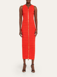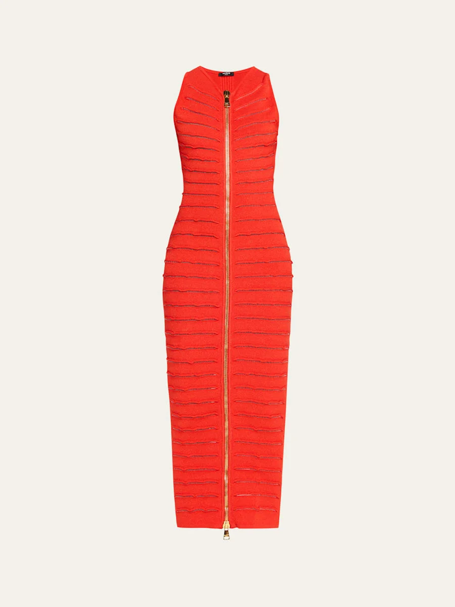 Balmain dress sculpts a sleek silhouette in sumptuous knit, elevated by slash cutouts and an exposed fulllength zipper with oversized, engraved double slider Halter neckline Sleeveless Bodyconscious silhouette Full length Twpway zip front Nylon/polyamide Professional cleaning recommended Made in France