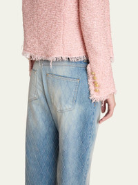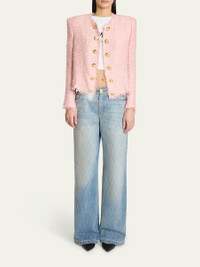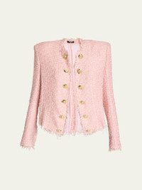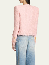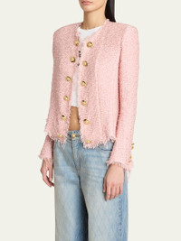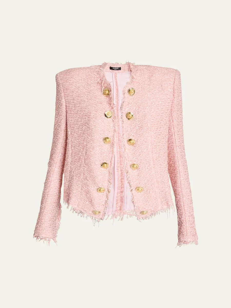 Balmain "Spencer" jacket in paillette tweed with fringed edges and signature buttons Round neckline; open front Long sleeves; button cuffs Padded shoulders Straight fit Hip length Silk Professional cleaning recommended Made in Poland Online Inquiries: BGS21_B9YUE| Store Inquiries: #5008982